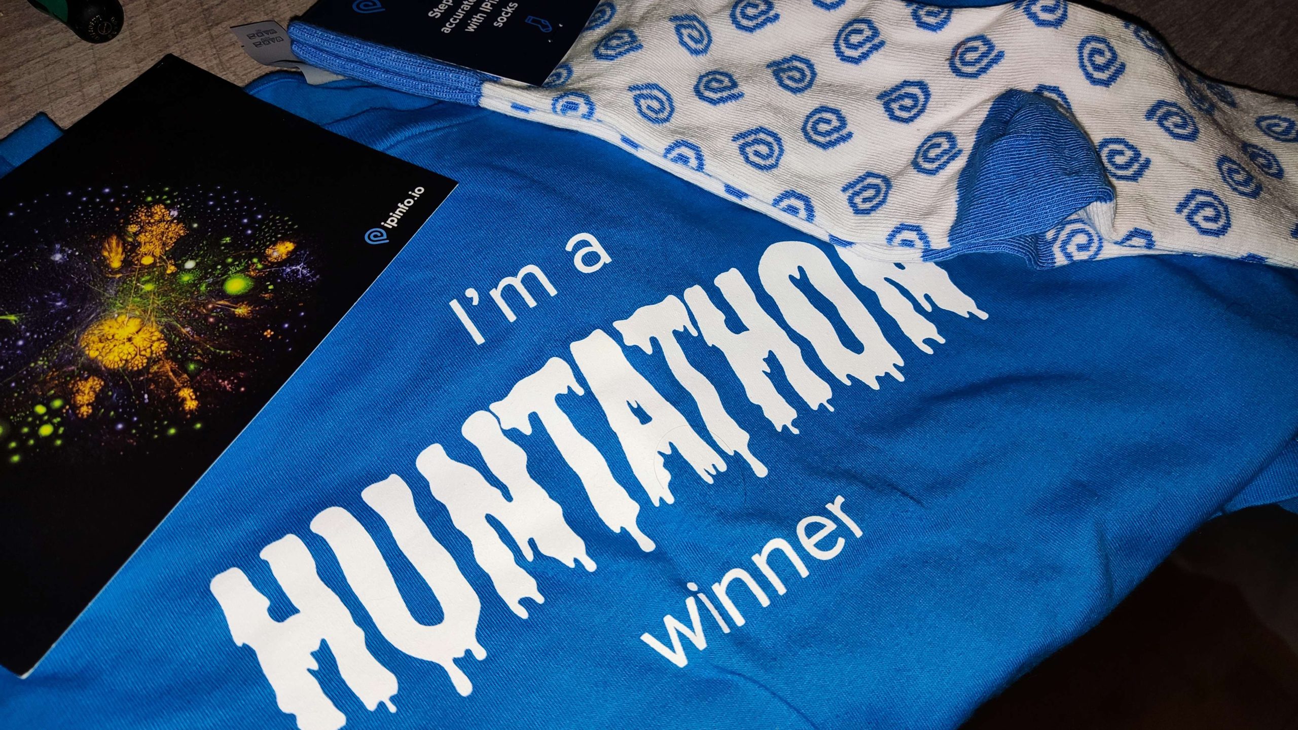 I got myself a sticker pack, an “I am a Huntathon Winner T-Shirt”, a Notecard with a map of the Internet, and some IPinfo socks.
